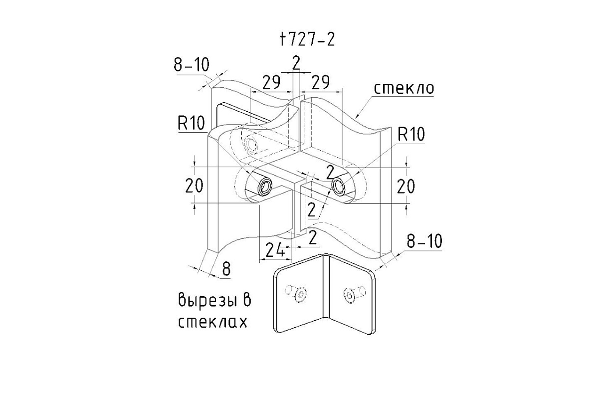 Коннектор разбирается на три стекла. Затем к нему прикладывается стекло с заранее заготовленным вырезом согласно чертежу и с обратной стороны ответная часть притягивается с помощью винтов к стеклу