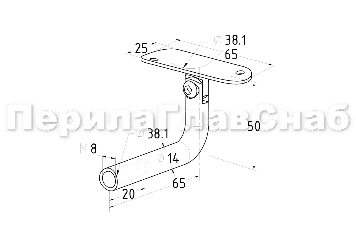 Боковой держатель поручня выносной, на стойку Ø38.1 мм, с регулируемым ложе под поручень Ø38.1 мм, резьба внутренняя, М8