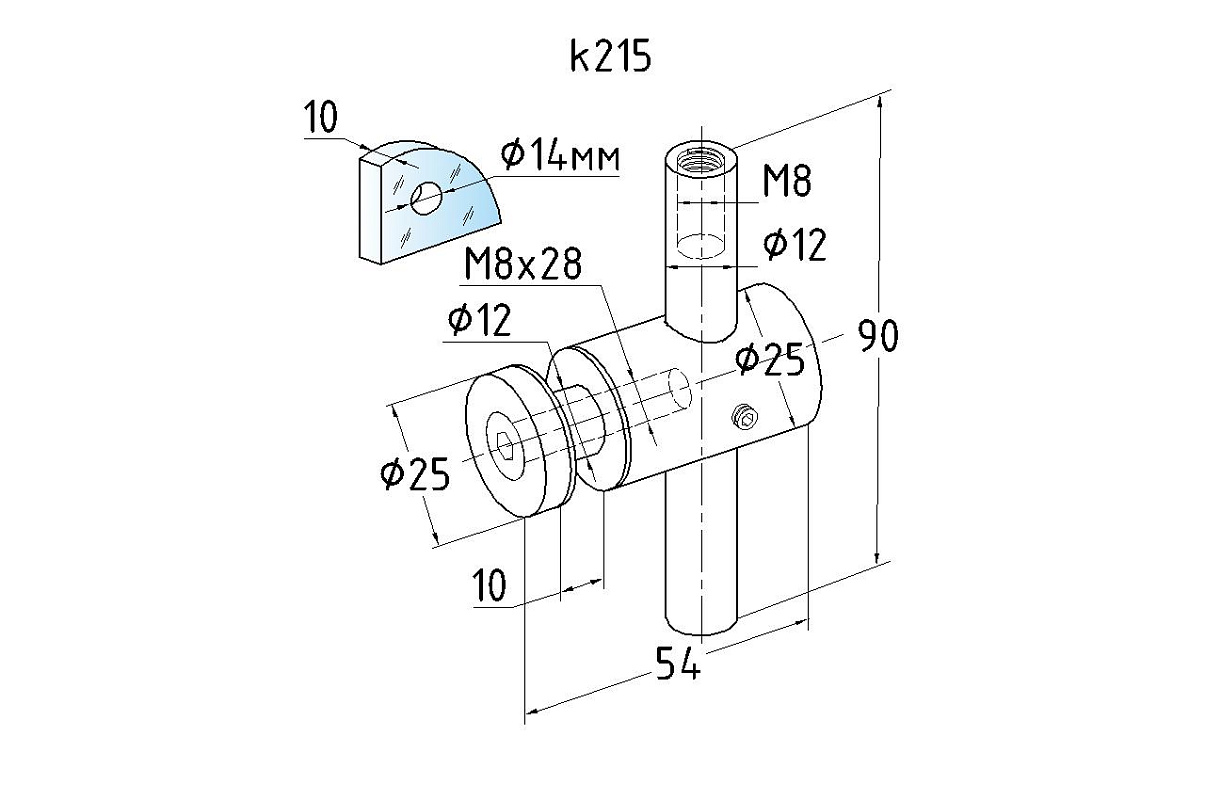 2 гайки Ø25 мм, в комплекте с втулкой  k503 и винтом М8, палец Ø18х106 мм. Благодаря наличию регулировки, отступ кромки стекла относительно оси стойки может доходить до 60 мм, а вынос составляет 30 мм