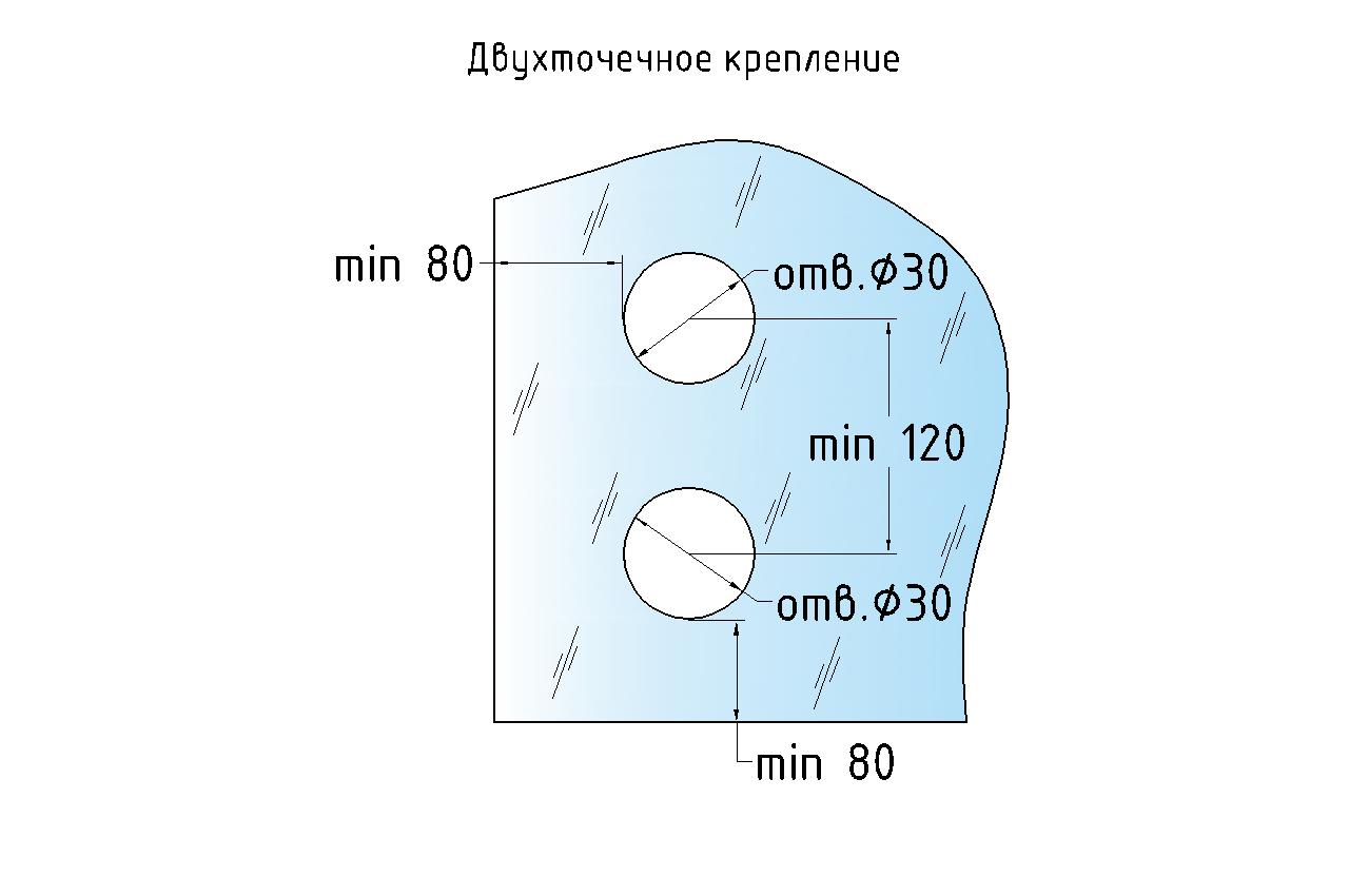 Точечный стеклодердатель для торцевого крепления несущего стекла в широчайшем диапазоне от 8 (4+4) мм до 40 (20+20) мм. Шпилька диаметром 16 мм и длиной 200 мм тестировалась на срез под нагрузку 2 тонны. Диаметр наружной (18 мм, хрюшка) и внутренней (10 мм) шайб по 50 мм.