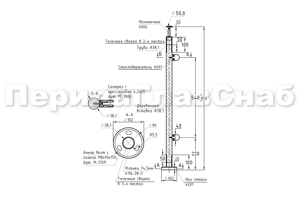 Готовая стойка Ø38,1 мм, с фланцем и наконечником, высота 950 мм, полированная (AISI 304) k702 купить в Алматы