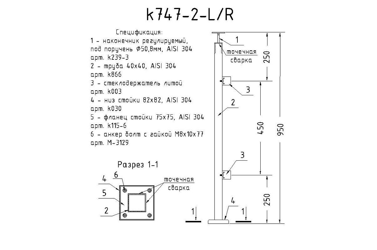 Стойка квадратная 40х40: 2 литых квадратных стеклодержателя, шлифованная, высота 950 мм (AISI 304) k747-2-L/R