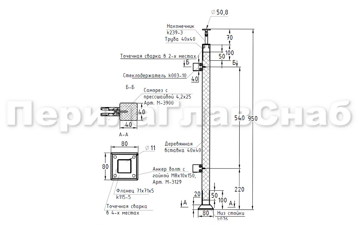 Готовая стойка 40х40х950 мм, деревянная, со вставками из нержавеющей стали 2х100 мм с 3 ригеледержателями k740-1-G купить в Алматы