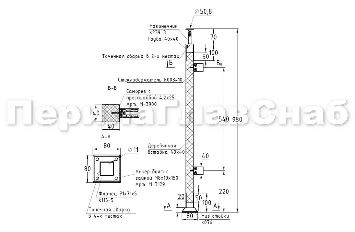 Готовые стойки – это экономия вашего времени и денег. Приобретая готовую стойку Вы можете собрать ограждение сами, не привлекая монтажную бригаду и экономя денежные средства на монтаже. Стойка легко монтируется к полу благодаря четыреханкернуму фланцу с отверстиями под анкер-болт М8 ( , , ) или шпильку ( ; ) в комплекте с хим анкером или , а крепеж скрывает декоративная крышка идущая в комплекте стойки. Поручень из нержавеющей стали можно закрепить при помощи самореза (, , ), либо при помощи заклепки () и винта М6 (М-3973) что на порядок эффективней, для крепления при помощи заклепок необходимо растачивать отверстие в ложементе. Если вы используете деревянный поручень, то его можно закрепить при помощи саморезов ( , , ). После покраски дубовой проставки подклеиваете клеем ( , ). Ограждение готово!