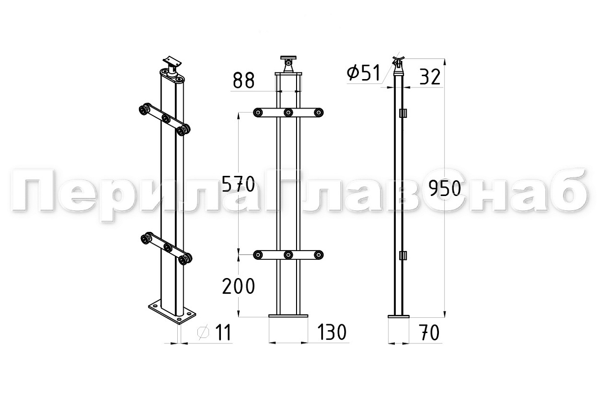 Стойка квадратная 40х40: 4 литых стеклодержателя, шлифованная, высота 950 мм AISI 304 k746-7 купить в Алматы