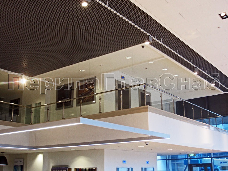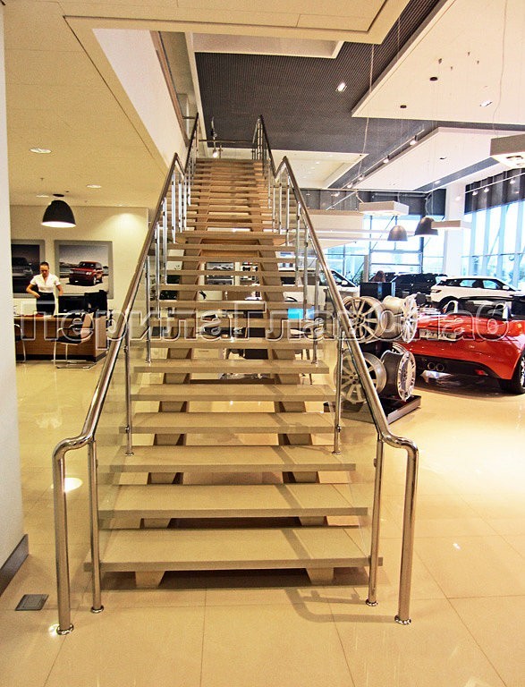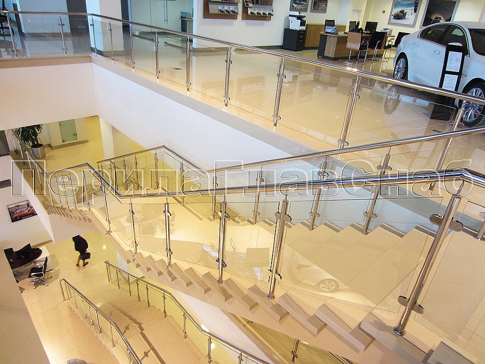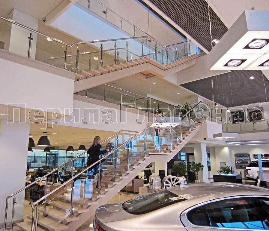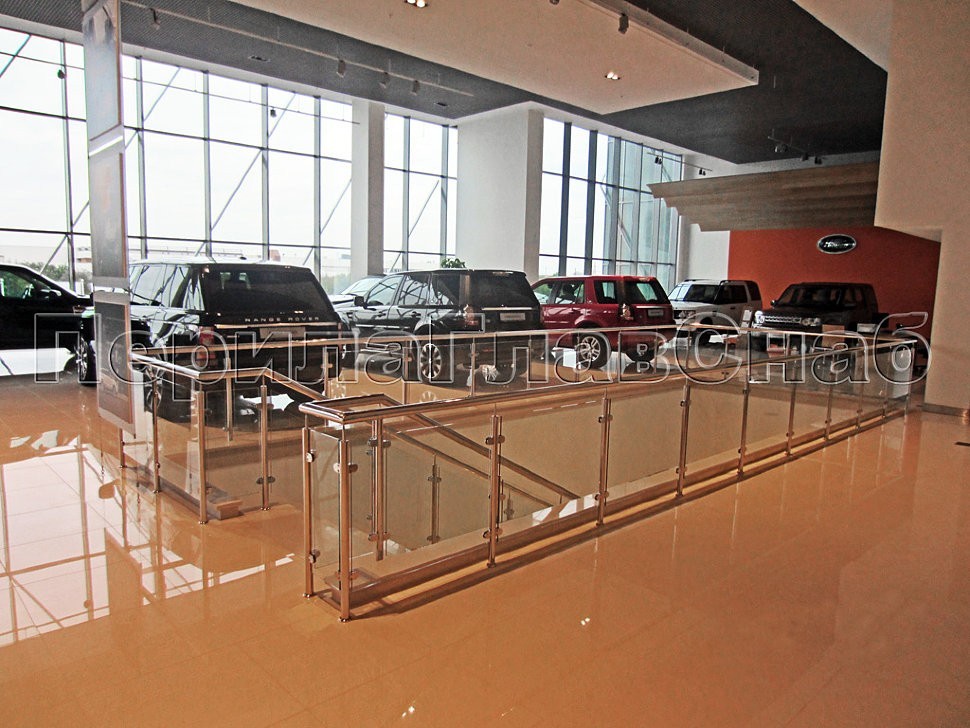 Для лестниц автосалона конструкторским отделом ПерилаГлавСнаб было разработано специальное техническое решение, так как эти лестницы не стандартны, и состоят из двух лестничных маршей, разделенных посредине площадкой. Техническое решение включало в себя соединение поручнем лестничного ограждения со стеклом по всей длине, а в начале лестничного марша, для наибольшего удобства, были предусмотрены боковые отводы.