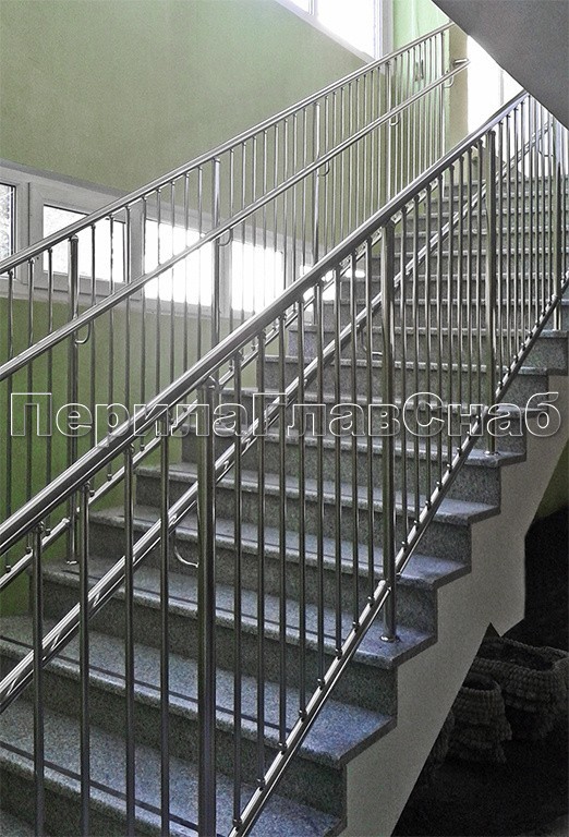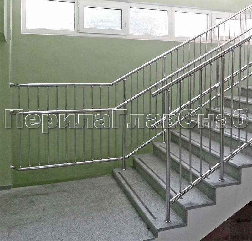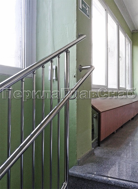 Перила для прямой лестница с креплением нержавеющего поручня к стойкам через полусферические наконечники.