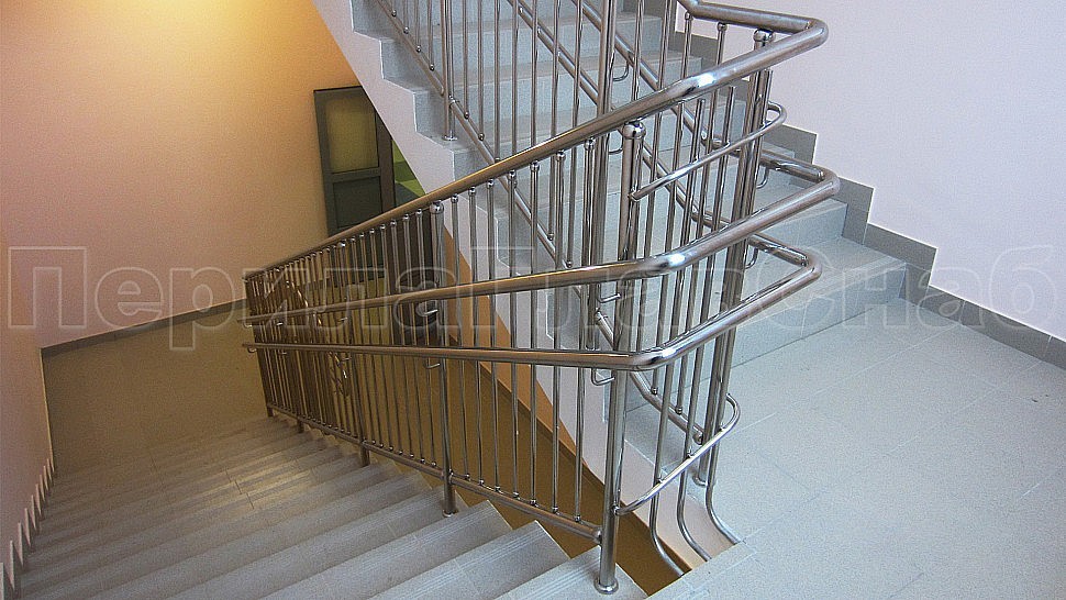 - У лестницы же стойки имеют высоту чуть большую — 950 мм, труба Ø38 мм. Устанавливаются на расстояние через две ступени в третью, на прямых участках не более 1000 мм друг от друга. Наконечник выполнен в декоративном стиле в виде сферы. Для большей безопасности установлены семь ригелей между стойками, и, в отличие от пандуса, они крепятся к стойке сваркой снизу и установлены вертикально. Поручень двойной диаметром 38 мм установлен на высоте 700 мм и 900 мм, крепится к стойке на выносных держателях и на поворотах завязан бубликом.