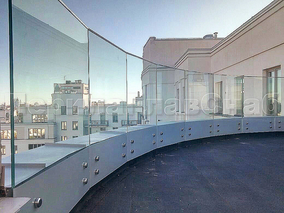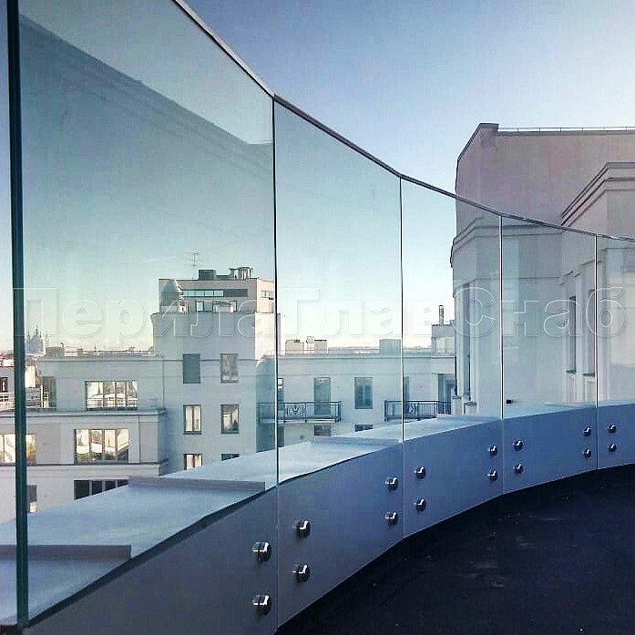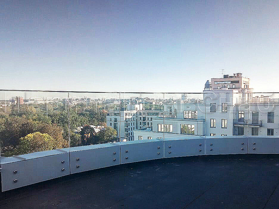 В северной столице установили стеклянные ограждение кровли на точечном креплении. Что бы укрепить конструкцию, сверху стекол мы смонтировали П-образный профиль AISI-304 из нержавеющей стали, благодаря которому стекла будут надежно закреплены. Стекло прозрачное, закаленный триплекс толщиной 8+8мм с полировкой кромок по периметру каждого стекла. Высота стекла 1500мм. Стекло крепится в ж/б парапет на нержавеющих держателях (шпильках) стали марки AISI-304 Ф16мм