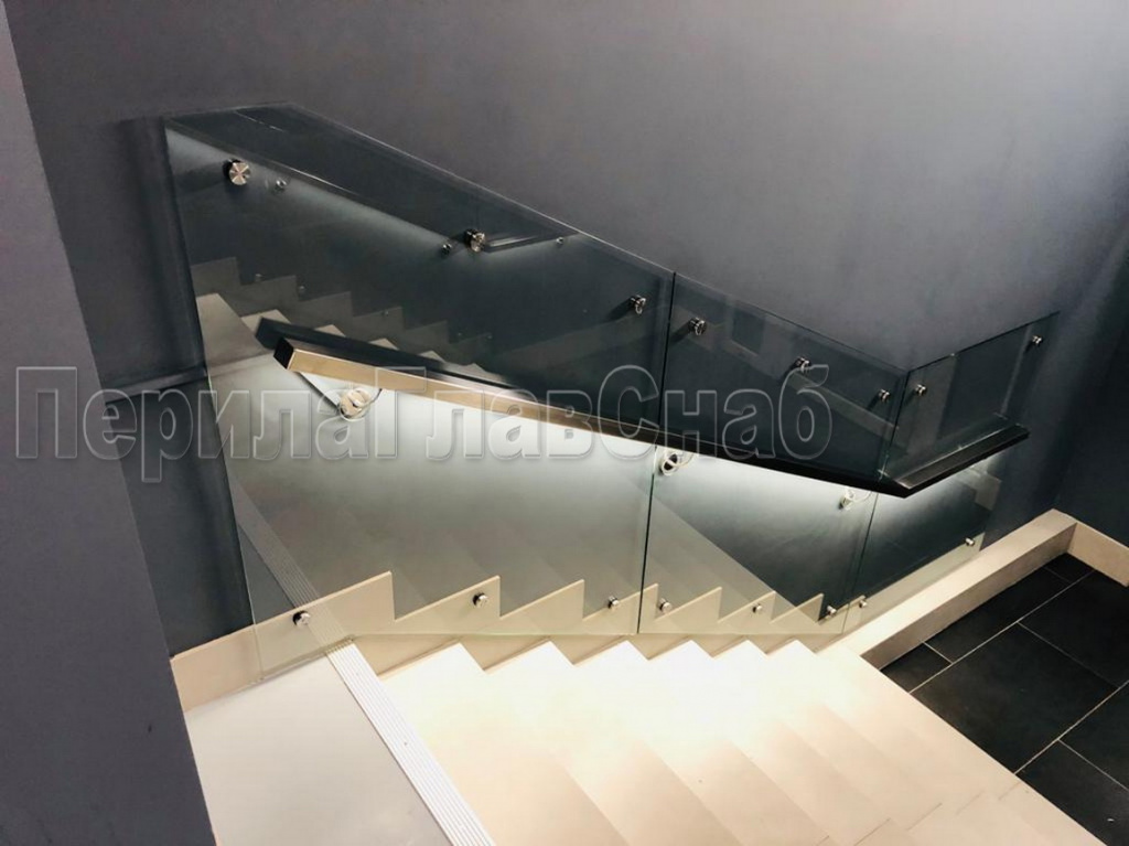 Конструктив: профильная труба 40х40 мм с пазом и встроенной ЛЭД подсветкой, пристенные держатели, стекло
